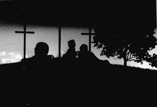 Zurück zu unseren Schnuppenspechtelversuchen. Im August 1977 war es endlich soweit. Zu dem üblichen Sommerurlaub von Laffy bei seiner Oma in Niederbayern gesellten sich Roland und Hausi, die mit dem Fahrrad eine Tour von Olching nach Pfarrkirchen machten. Auf dem Dreikreuzlsberg, ca. 15 Minuten mit dem Fahrrad von Omas Haus entfernt und etwas außerhalb des Ortes machten wir die ersten gemeinsamen Sternschnuppenbeobachtungen. Unheimlich war’s - Nebelschwaden zogen um den Berg, die drei Kreuze ragten düster in den Himmel, der Wind pfiff in dem einsamen Baum auf dem Berg. Ein geheimnisvoller Dunkelstrahl durchdrang den Nebel wie ein Autoscheinwerfer, nur eben mit dem Unterschied, daß er dunkel war…