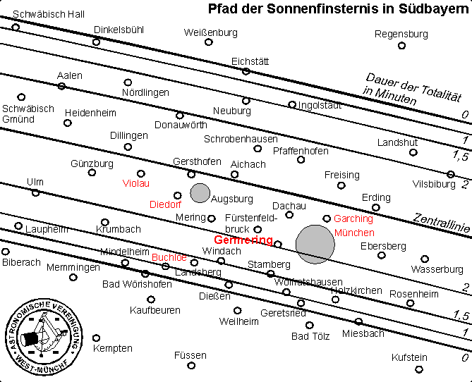 So hat der Manfred die Zentrallinie in genaue Karten eingezeichnet und war zwei Wochenenden unterwegs. All den hohen Ansprüchen wollte aber kein Standort genügen. Außerdem wuchs und wuchs die Zahl der Interessenten. Mit geringen Abstrichen an die Totalitätsdauer ist so ein Finsternisstreifen dann doch erstaunlich breit. Speziell südlich der Zentrallinie nimmt die Dauer durch eine leichte Eiform des Mondes nur langsam ab. Willi hat uns dann auf den Flugplatz in Gröbenried eingeladen, wo er Mitglied im Aero-Club Dachau ist.