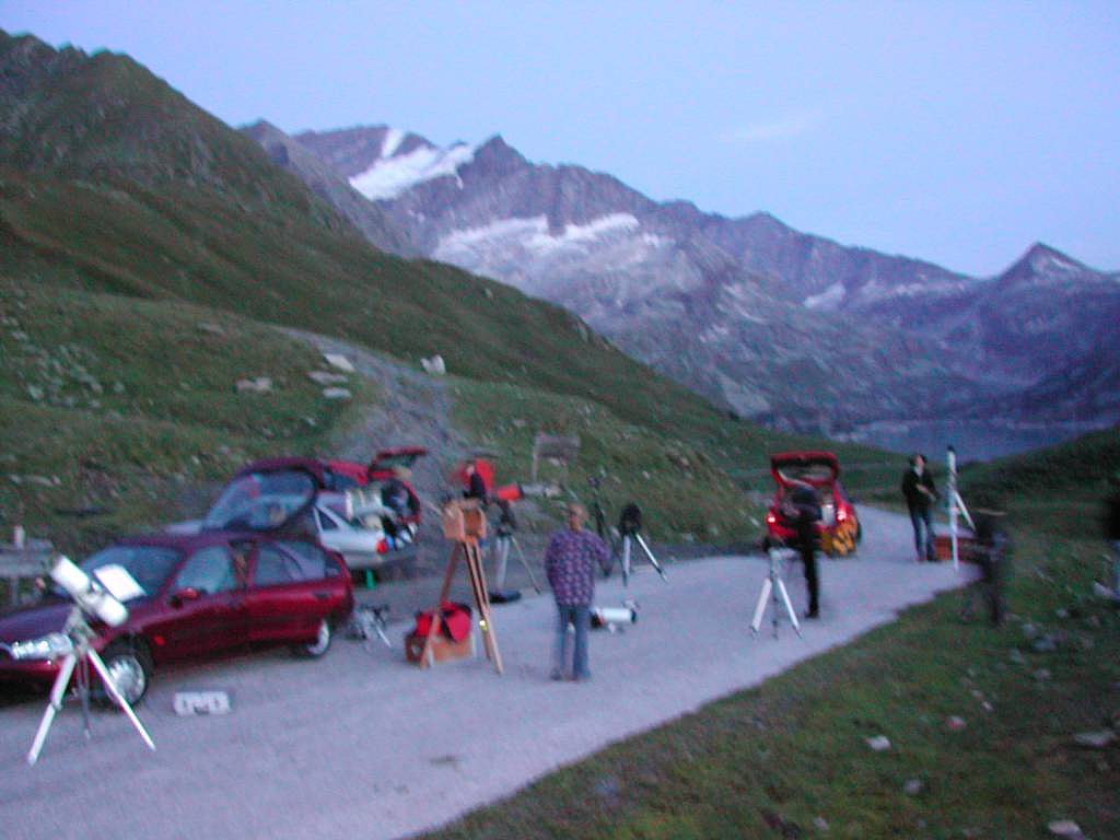 Nach einer ausgiebigen Brotzeit sind wir dann zum Beobachten aufgebrochen. Leider war wegen Revisonsarbeiten der Weg über die Krone des Staudamms bis zur Mittelstation der ÖBB-Seilbahn nicht möglich. Wir mussten daher auf dem davorliegenden Sattel aufbauen. Strom und einen Unterstand gegen Schlechtwetter haben wir dank sicherer Wetterlage gerne gegen eine noch etwas bessere Südsicht eingetauscht. Ausgerüstet waren wir sehr gut mit Großferngläsern 11x80 von Dr. Zschau und 20x105 der AVWM, meinem Refraktor 90/1000, zwei Newtons mit 114 und 150 mm Öffnung von Bernd und Schmidi, dem C8 der Schule, Dr. Zschau´s Zehnzöller-Schmidt-Cassegrain von Meade mit Computersteuerung und dem AVWM-12-Zoll-Dobson.
