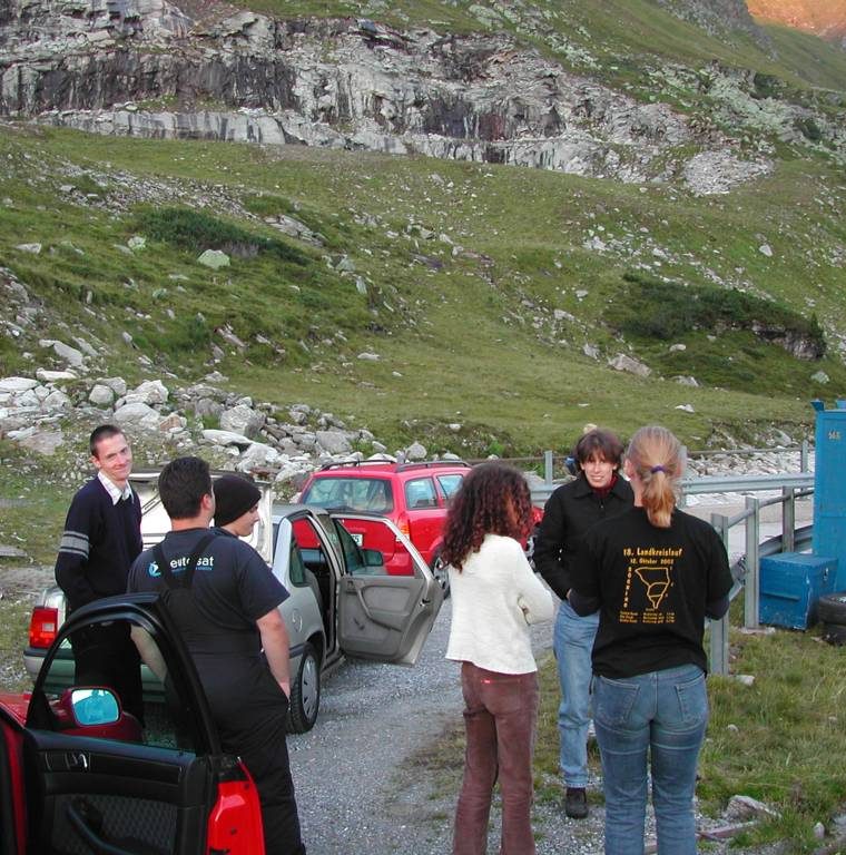 Kurz vor den letzten Kehren hatten wir eine Radlerin überholt, die schon nach Sonnenuntergang oben ankam. Neben dem Aufbauen entstand ein angeregtes Gespräch mit ihr, als ein zweiköpfiger Störungstrupp vom Kraftwerk vorbeikam. Die beiden konnten sich durch die großen Optiken einen ihrer höchstgelegenen Staudämme und die Rudolfshütte ansehen. Nicht lange nach deren Abfahrt kam der Jagdpächter mit Begleitung vorbei. Nach einigen Blicken durchs Teleskop konnten wir für ein bisschen Orientierung am Himmel sorgen und viele Fragen zur Astronomie beantworten.