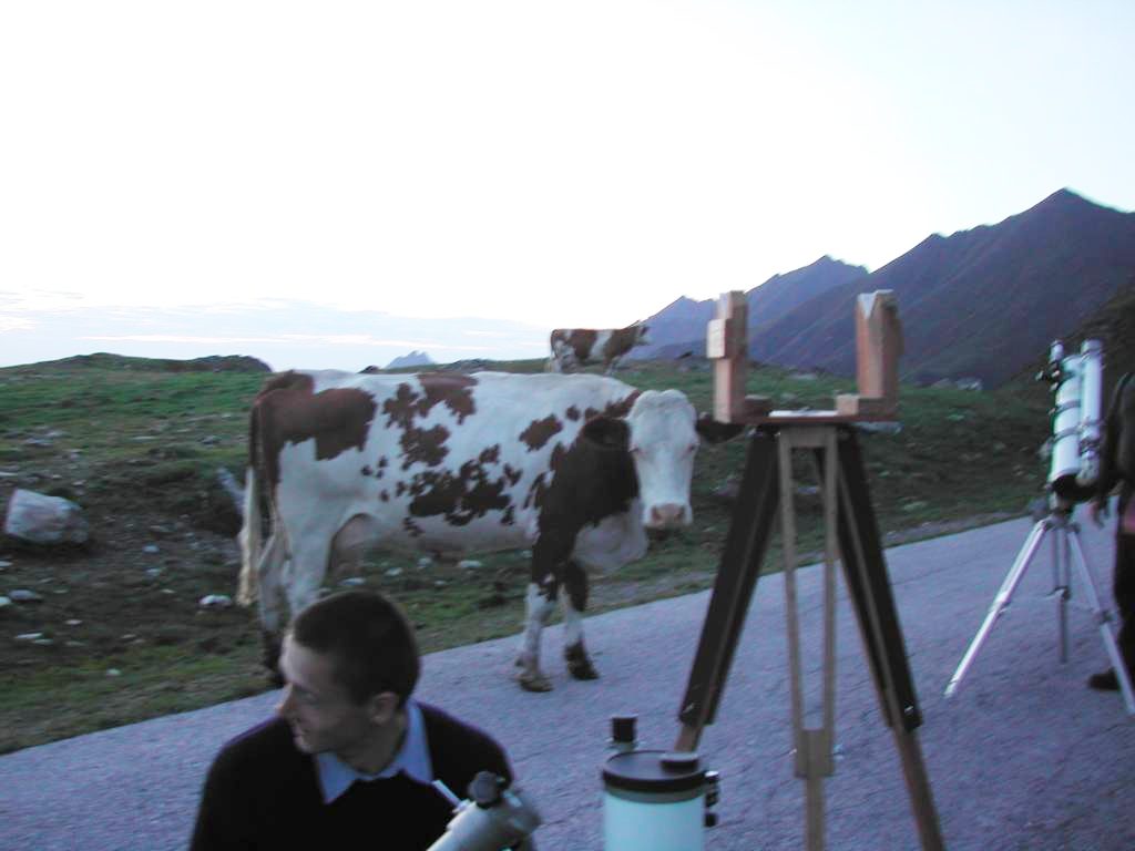 An unserem Beobachtungsplatz angekommen wurden wir von einer Gruppe Einheimischer neugierig begrüßt - Eine Herde Kühe interessierte sich sehr für unsere Geräte und das entstehende Nachtlager. Wir wussten die Neugierde nur kurzzeitig zu schätzen und mussten freundlich für einen Sicherheitsabstand sorgen. Zuvor waren schon ein Schlafsack per Zunge auf Dichtigkeit und eine aufblasbare Matte auf Trittfestigkeit geprüft worden.