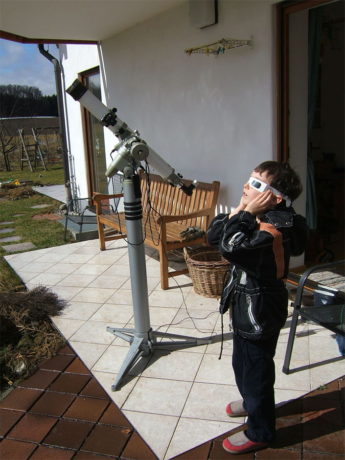Das Wolkenradar bestätigte: Das ist jetzt die Schauerzelle, aber sie ist nur mehr ein schmales Band. Bis 11:00 hatte ich dann notgedrungen Zeit zum Mittagessen. Dann aber öffneten sich große Wolkenlöcher und der Refraktor konnte in Betrieb gehen. Mittlerweile war auch Markus von der Schule heimgekommen und stand fasziniert mit einer Finsternisbrille neben mir. Nur der richtige Blick ins Okular wollte bei ihm nur selten klappen.